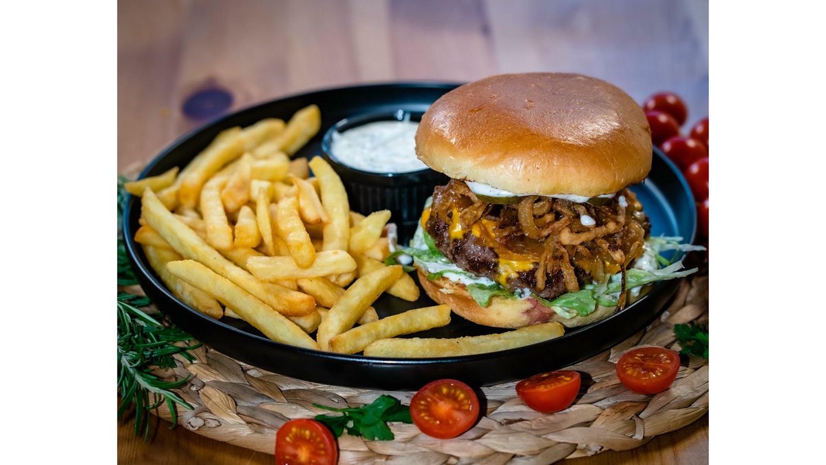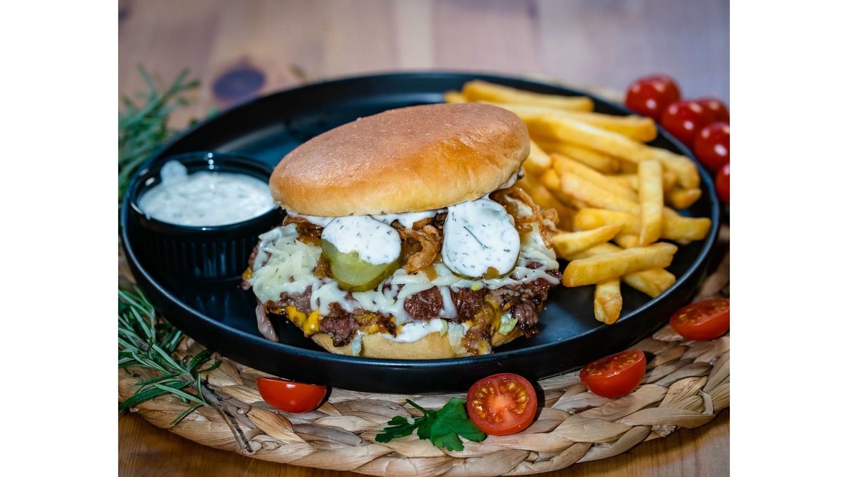 Carne vita, ceapa caramelizata, castraveti murati, sos mag,branza cheddar, cartofi, sos