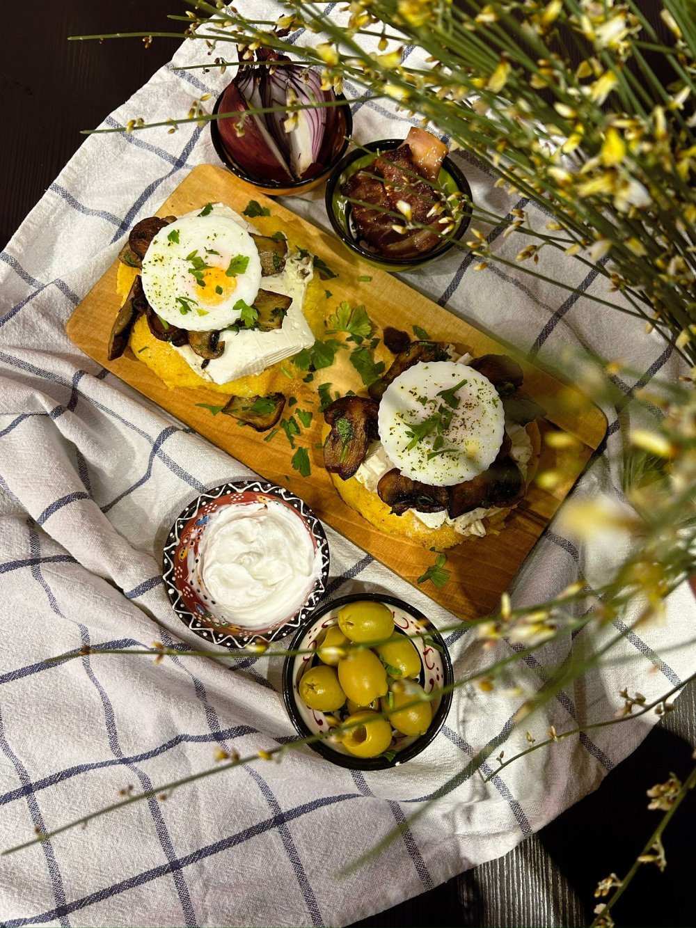 Ouă posate cu avocado,brânză feta prosciutto prăjit