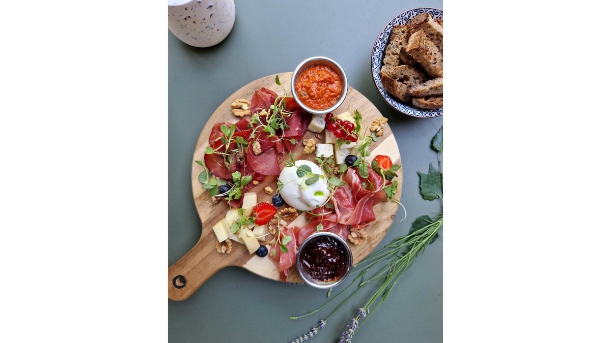 Scamorza afumata, burrata, gorgonzola, bresaola, prosciutto crudo, nuci, dulceturi pregatite de noi si paine artizanala cu maia 500 g