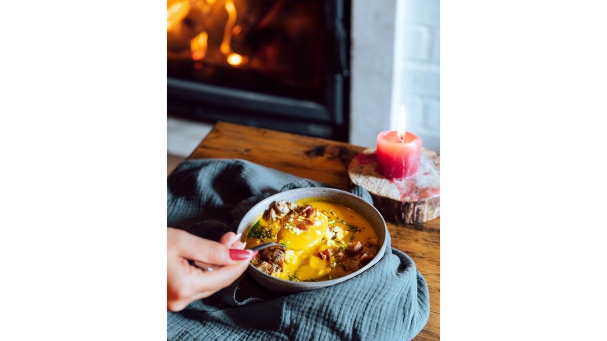 Supa crema de legume cu piept de porc crocant, telemea de oaie și dukkah 300 ml