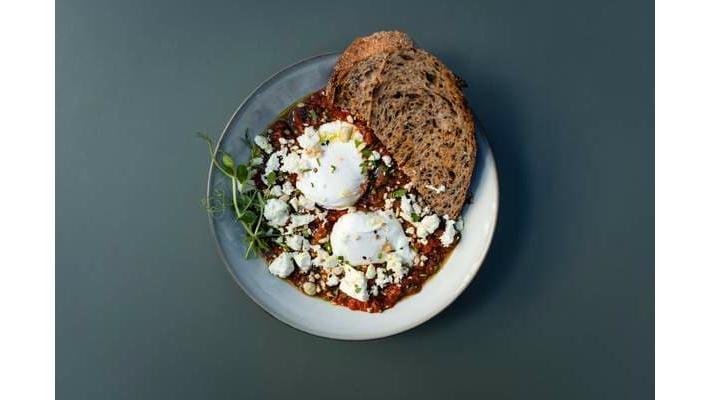cu oua posate, telemea de oaie, dukkah, ardei iute, ulei de patrunjel si paine artizanala - 360 g