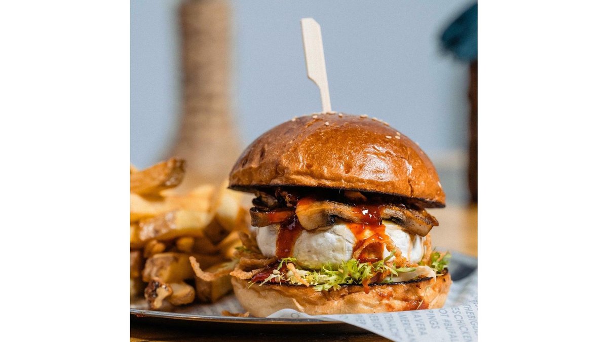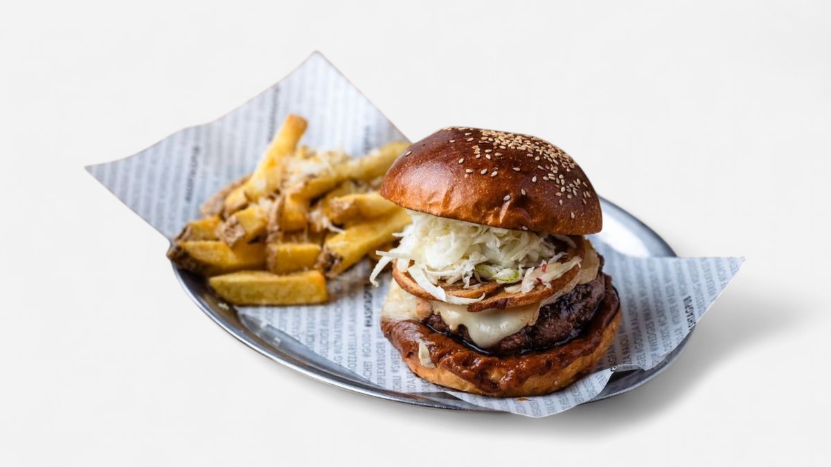 Carne de vita Black Angus, taleggio, pancetta crocanta, slaw cu varza alba, mar si fenicul, peanut butter BBQ, ceapa rosie murata, chifla artizanala cu maia, fries, basil aioli 490 g