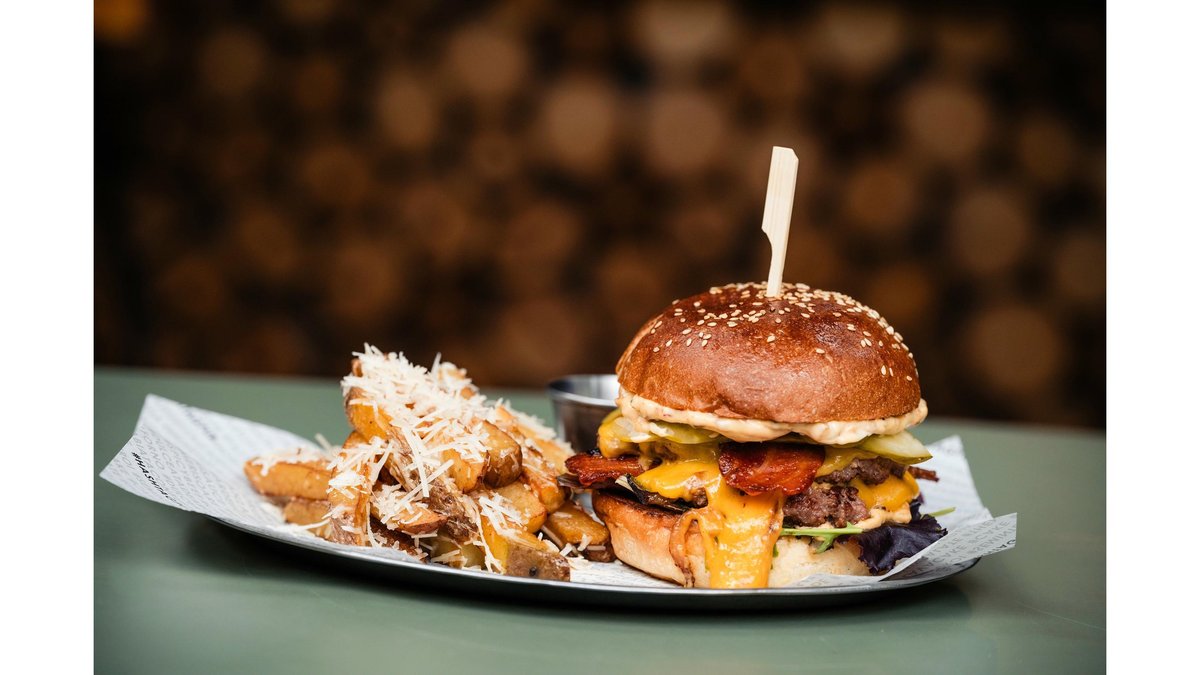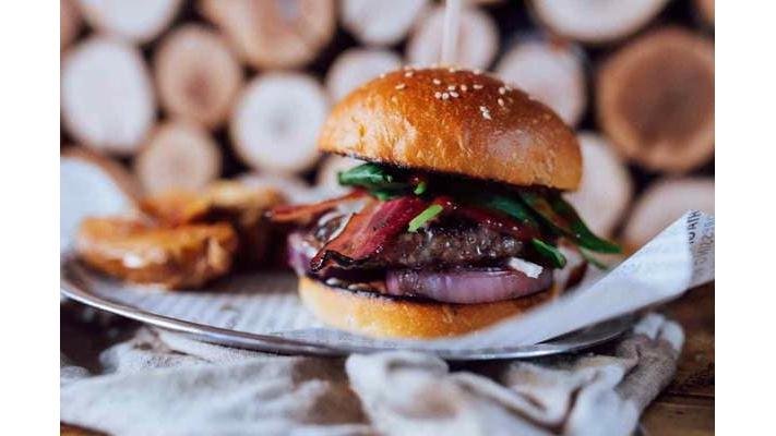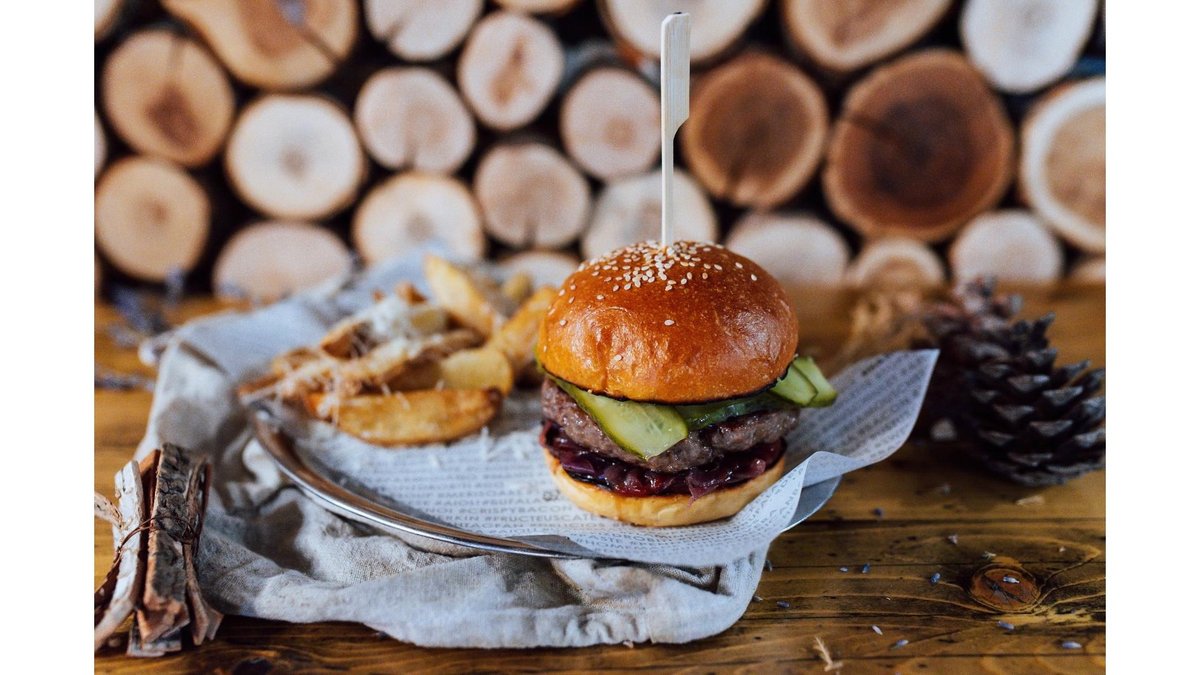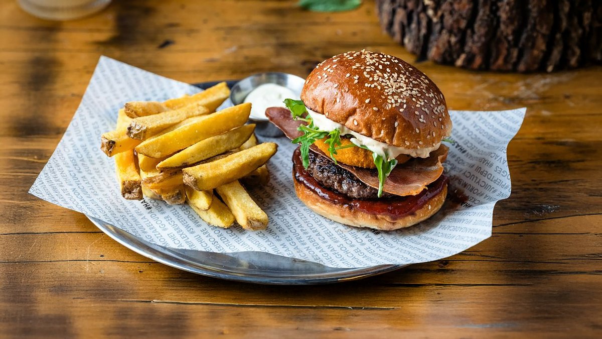 Carne de vita Black Angus X 2, bacon x 2 , branza maturata Trapist x2, castraveti murati, ceapa rosie, maioneza, sos barbeque, fries & basil aioli, chifla artizanala cu maia - - 620 g