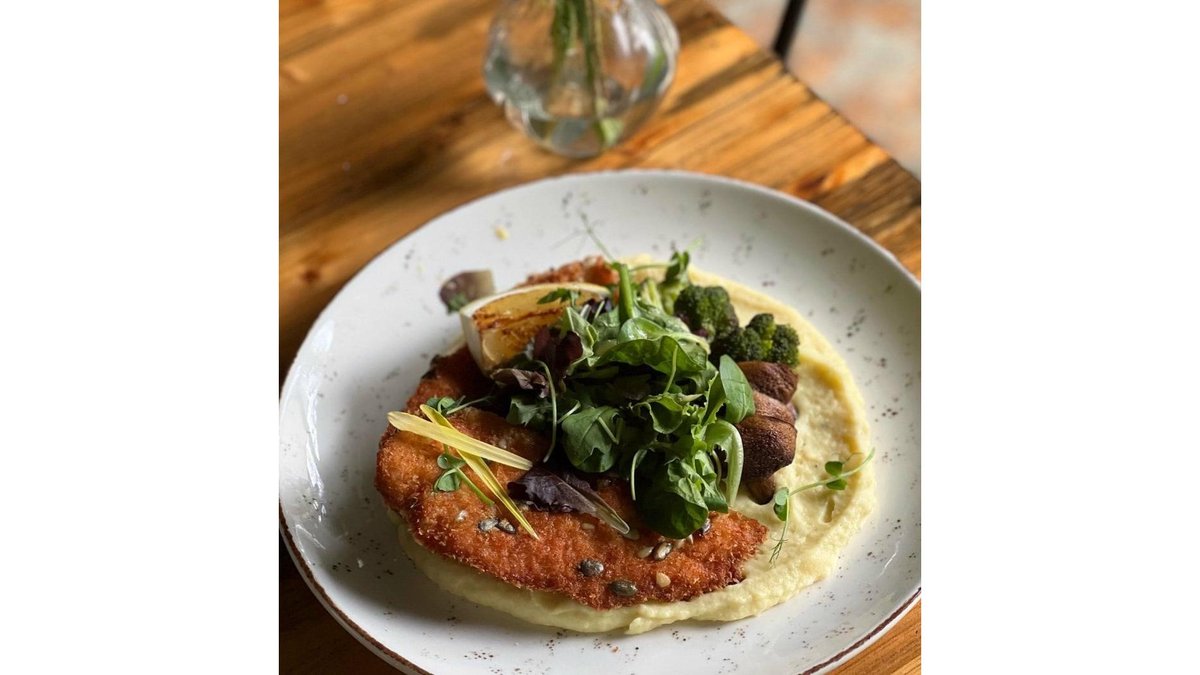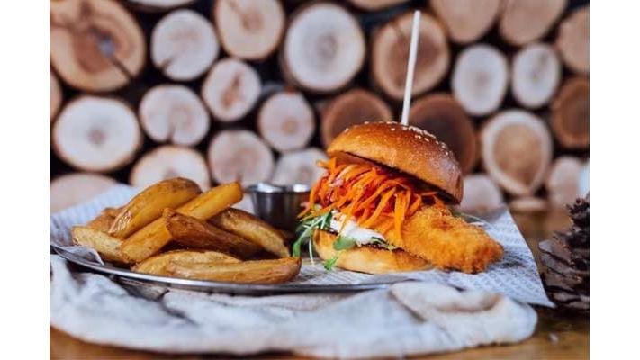File de pastrav in crusta de panko, coleslaw, salata, jalapeno tartare, fries & basil aioli, chifla artizanala cu maia - 450 g