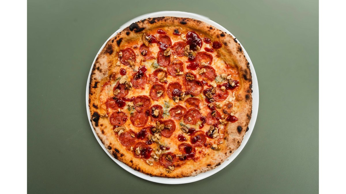 Sos de rosii San Marzano, mozzarella, salam Ventricina picant, gorgonzola, dulceata de ardei iute, nuci 520 g