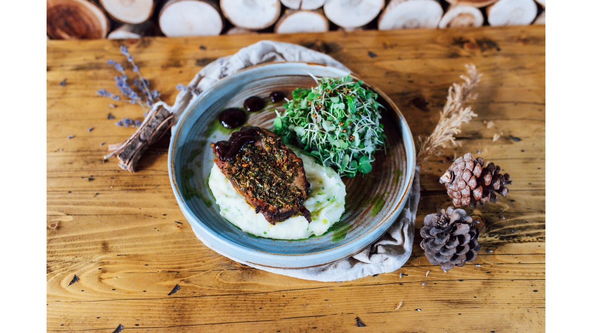 Ceafă de porc coaptă pe jar, chimichurri, piure cremos de cartofi cu pătrunjel, dulceață de ardei iute, mix de salate 370 g