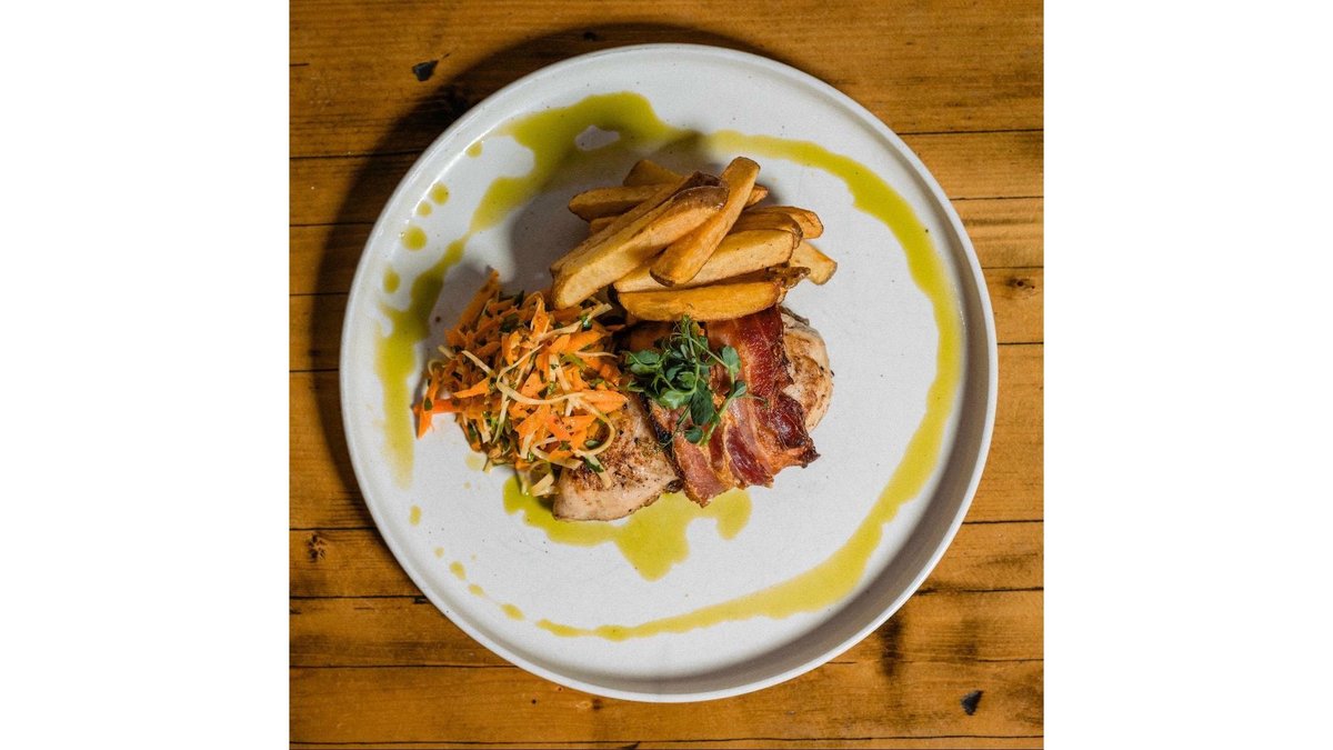 Piept de pui, sos de ciuperci, rosii uscate, branza maturata Apuseni de la Torockoi, bacon crocant, coleslaw cu morcovi si telina, cartofi prajiti - 380 g