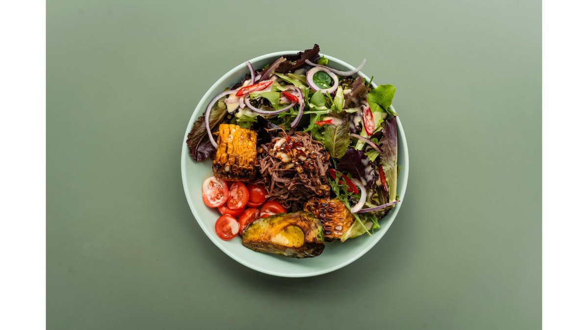 Pulled beef, avocado, porumb, rosii, ceapa rosie, ardei iute, vinegreta de mustar Dijon, mix de salata si focaccia - 350 g