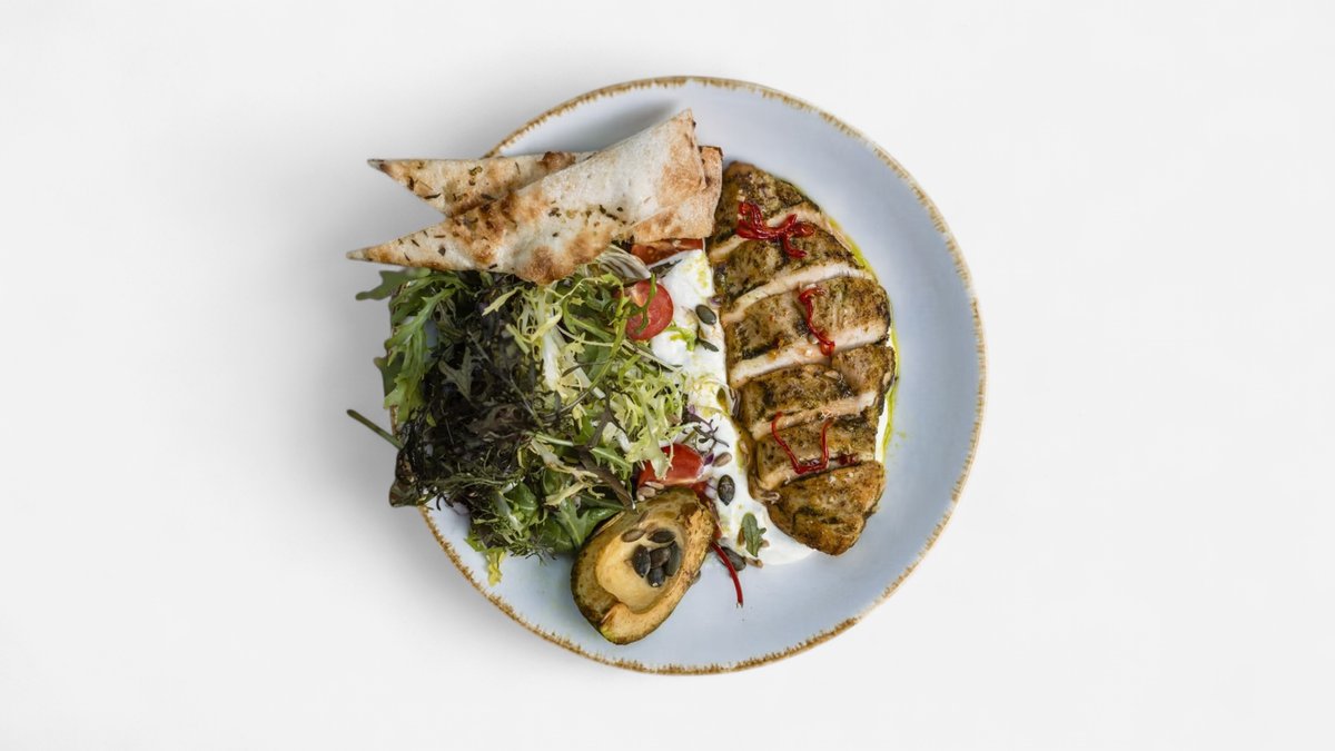 Piept de pui pe gratar, crema de telemea, rosii cherry, avocado, ceapa rosie, mix de seminte, vinegreta de mustar Dijon, mix de salata, focaccia - 380 g