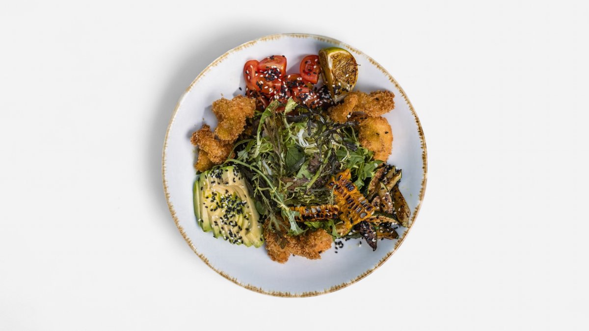 Creveți in panko, avocado, rosii cherry, porumb, zucchini, lime, susan, vinegreta de muștar Dijon, mix de salată 350 g