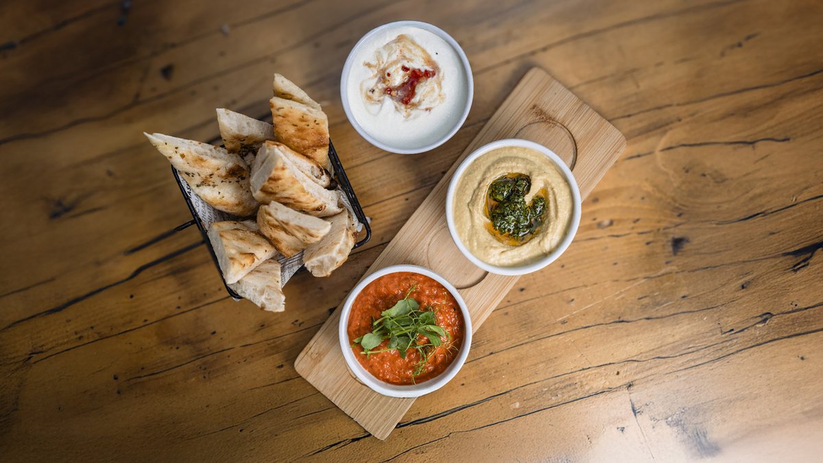 Hummus & chimichurri, salsa de ardei copti, crema de telemea & chilli honey, focaccia - 400 g