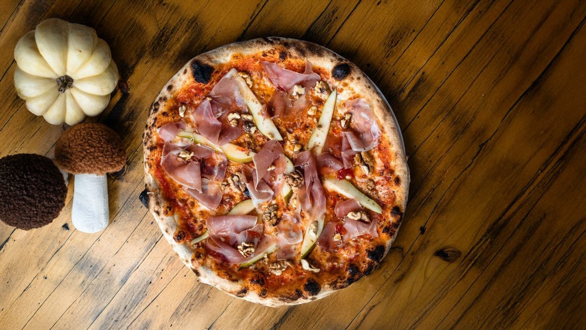 Sos de rosii San Marzano, mozzarella, taleggio, prosciutto crudo, pere, nuci, miere picante 520 g