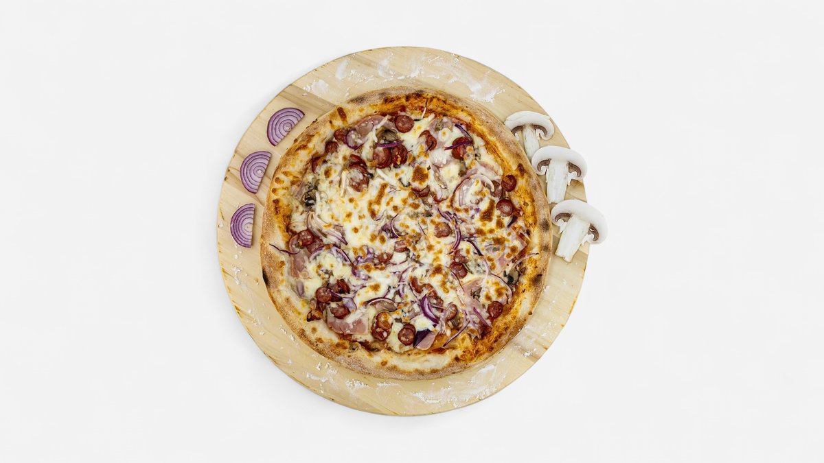 Sos, mozzarella, șuncă, cârnați, bacon, ciuperci, ardei, măsline