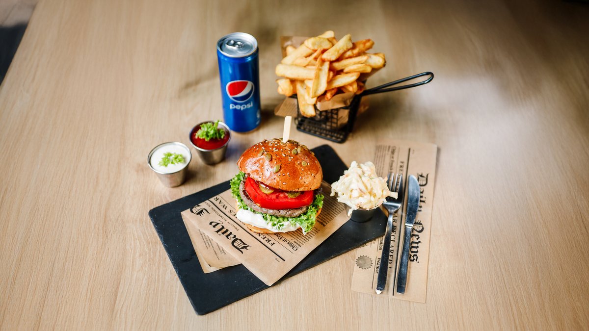 Meniu Burger classic de vita si cartofi prajiti