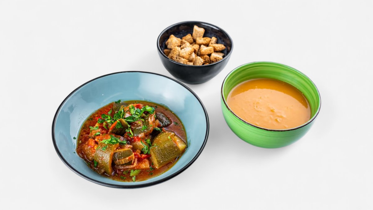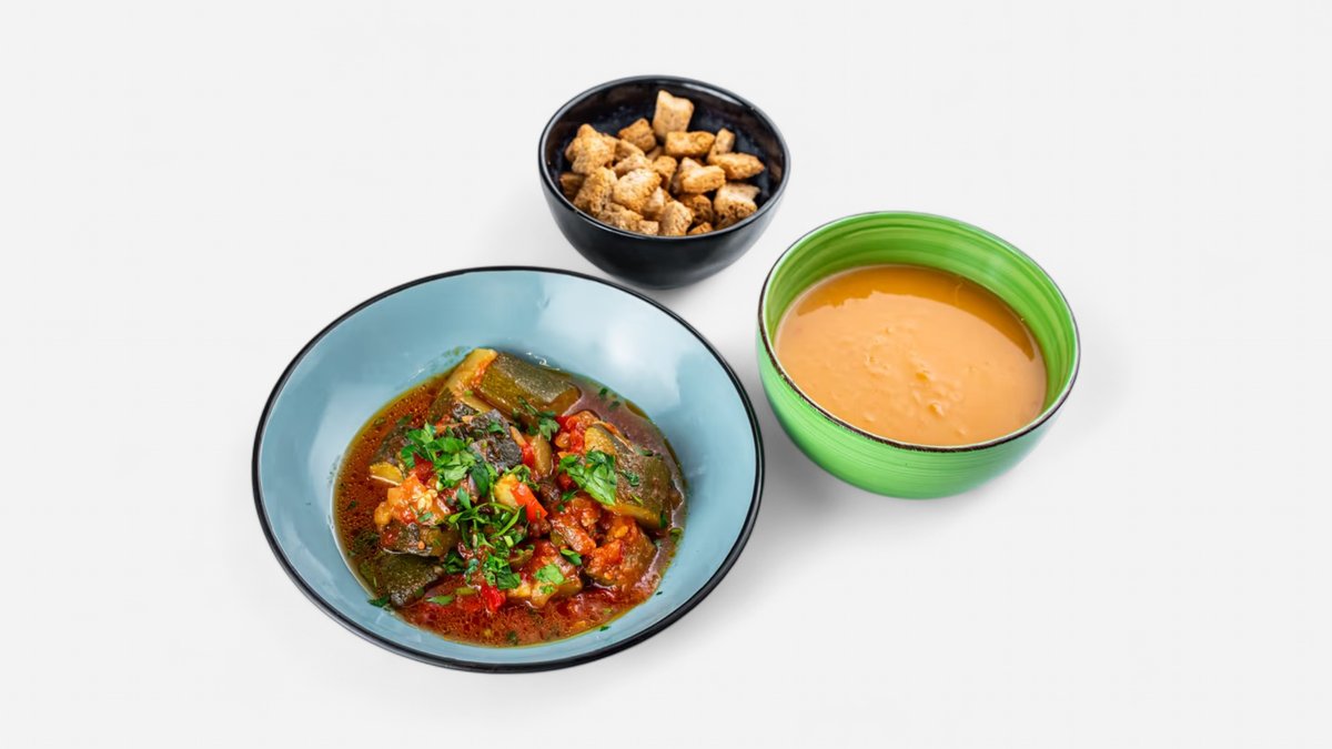 Supa crema de linte cu ardei copt(330 ml)+ghiveci calugaresc(300 gr)
