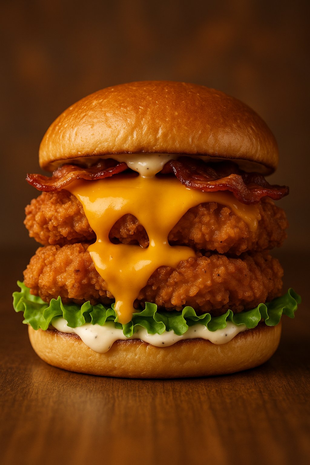 Chiflă artizanală 80 g, piept de pui crispy 300g, gouda 20 g, bacon 20 g, ceapă caramelizată, sos de maioneză cu trufe, 460 G