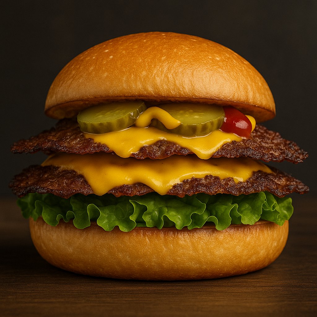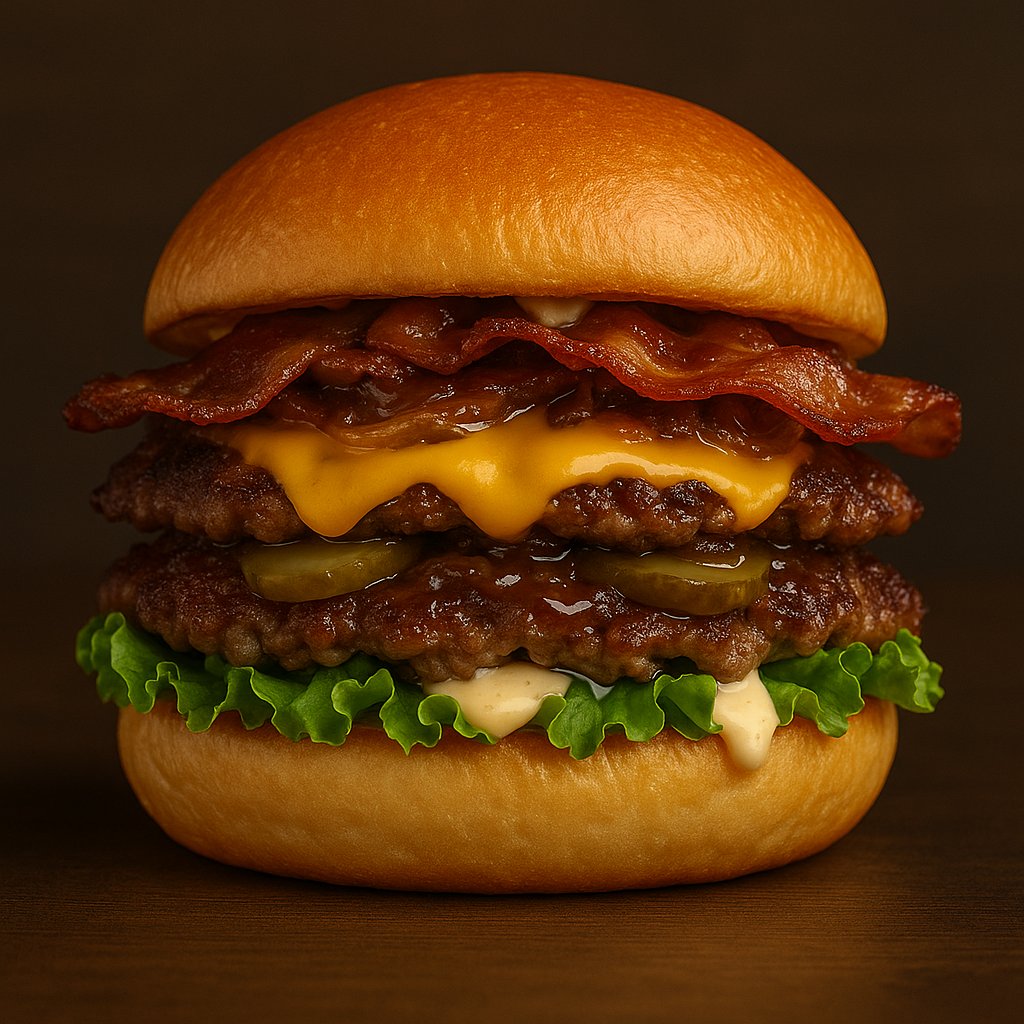Chiflă artizanală 80 g, 2 x paline de vită angus smashed 160g, cheddar 20 g, bacon crocant 20 g, ceapă caramelizată, castraveți murați, sosul casei, salată, 310 G
