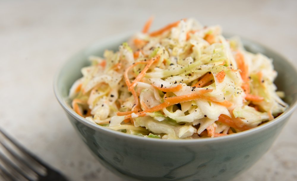 Salată de varză albă, varză roșie, morcov, asezonată cu sos colleslaw