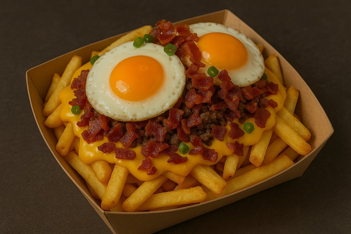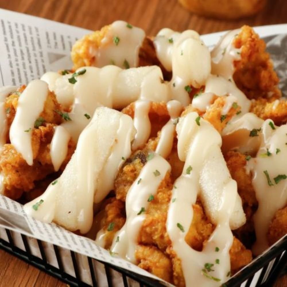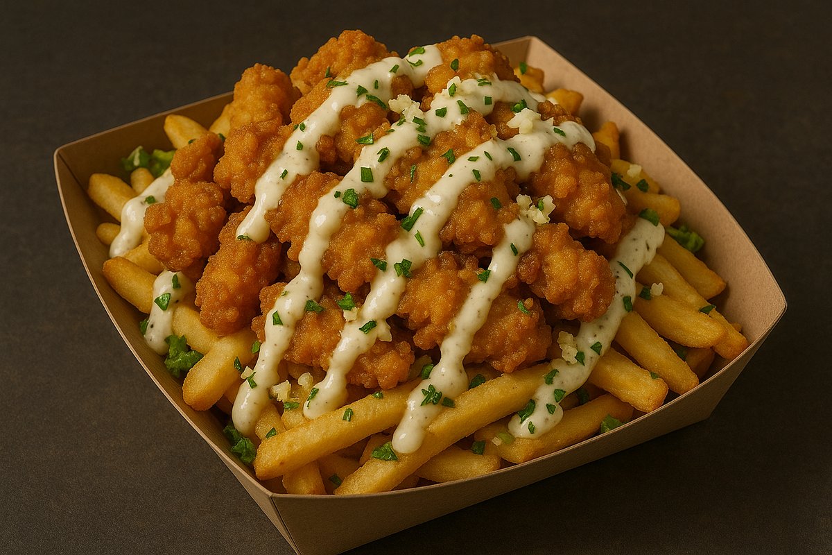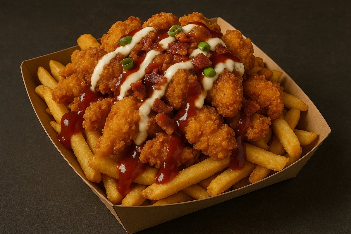 Cartofi aurii (200 g) + crispy de pui (100 g) + sos bbq (30 g) + sos cheddar (20 g) + ceapă verde (10 g). 360 g • 270 kcal / 100g.