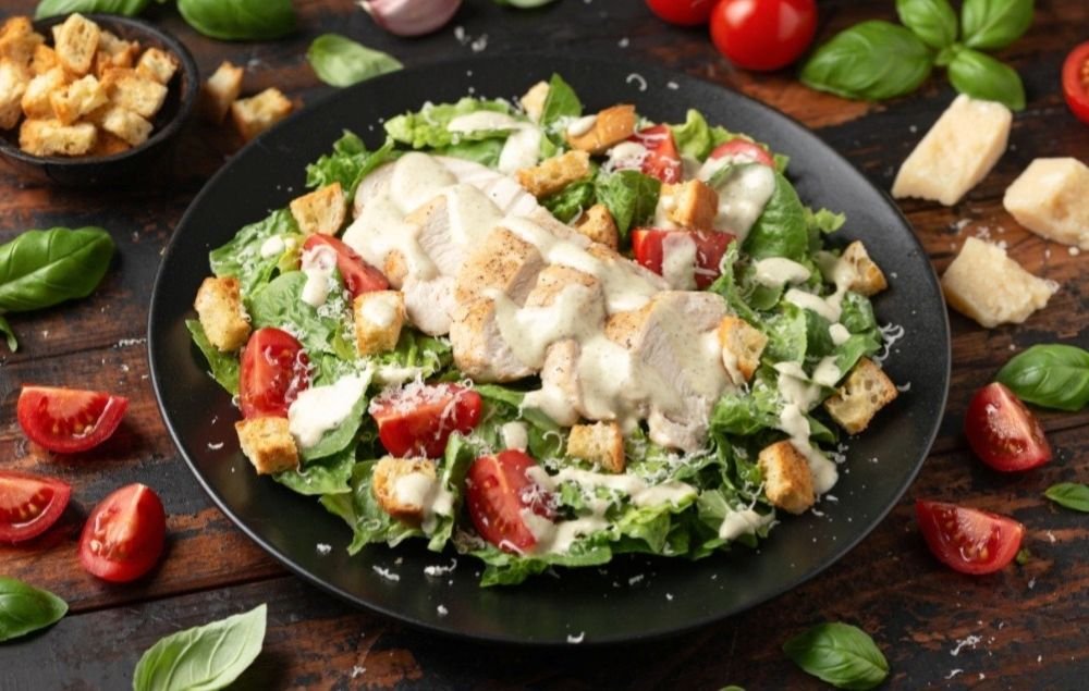 Salată verde, roșii, ceapă roșie, avocado, piept de pui la grătar 100 g, branză feta, sos de muștar cu miere, 360 G