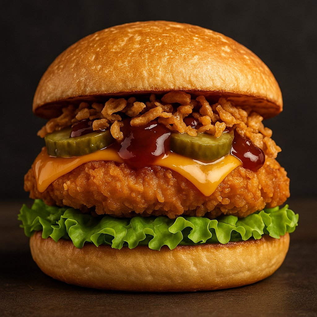 Chiflă artizanală 80 g, piept de pui crispy 150 g, cheddar 20g, castraveți murați, ceapă crunchy, sos bbq, salată, 310 G