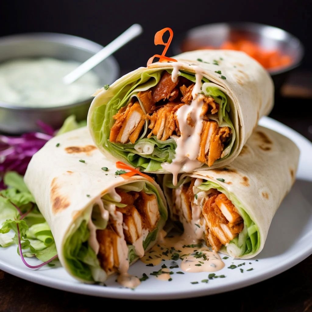 Rulou din lipie rumenită 70g, pui crispy 150 g, salată verde 15g, roșii 20 g, ceapă 15 g, sosul casei, 300 G