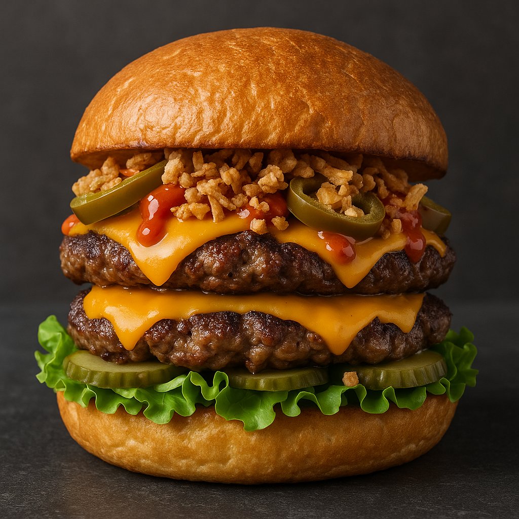 Chifla artizanala (80 g), doua paline de vita angus smashed (160 g), cheddar (20g), jalapenos (20 g), ceapă crunchy (10 g), castraveti murati (10 g), sos siracha (10 g), salata verde. 310 g • 285 kcal / 100g.