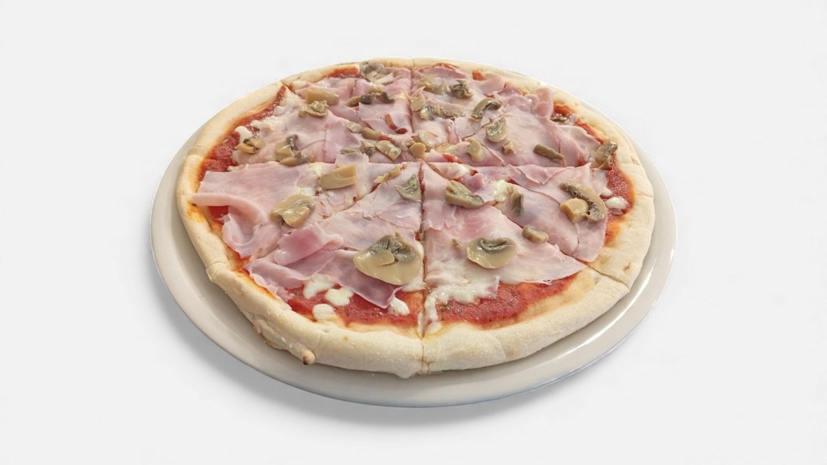 Pizza facuta cu blat italian, sos de rosii, sunca italiana, ciuperci, oregano