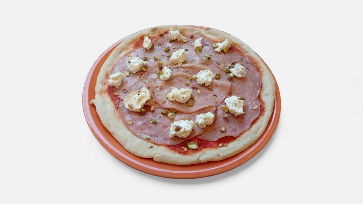 Pizza facuta cu blat italian, sos de rosii, mortadella, ricotta, bucatele de fistic