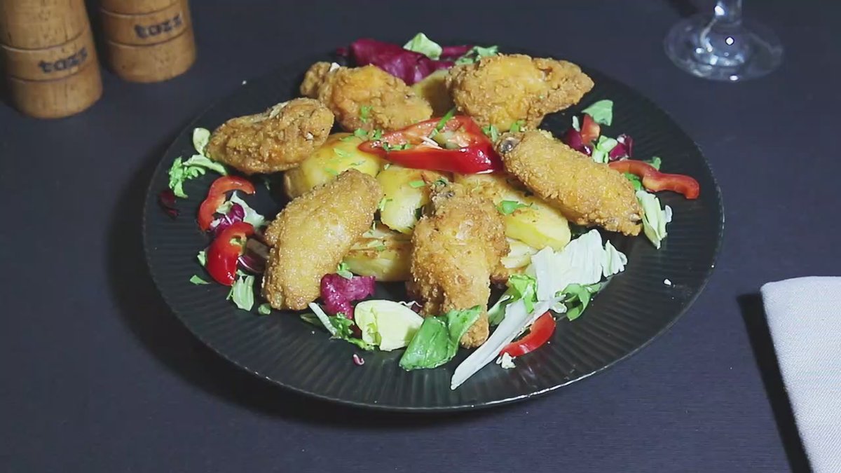 Aripioare de pui pane + garnitură + pâine + salată de varză