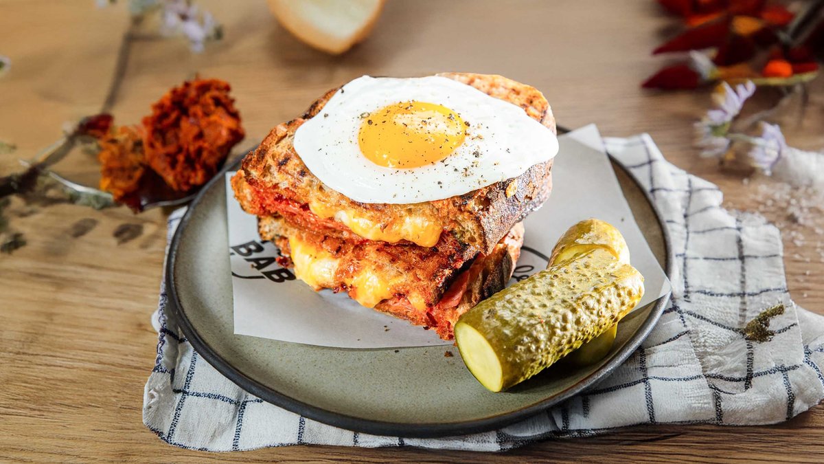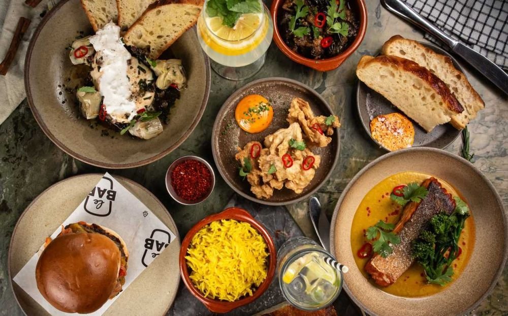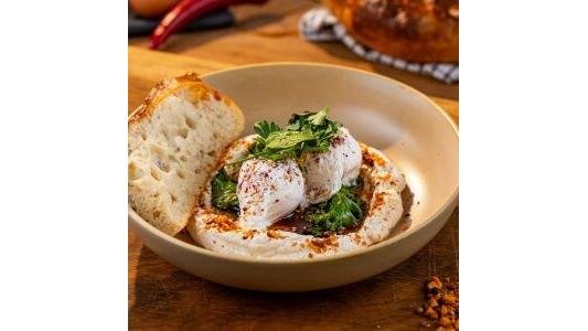 Poached eggs with house labneh, organic sautéed greens, crispy chilli butter,Le Bab dukka mix & toasted house-made focaccia Ouă posate cu labneh de casă, verdeață sotată organică, unt crispy chilli, dukka și focaccia prăjită în casă