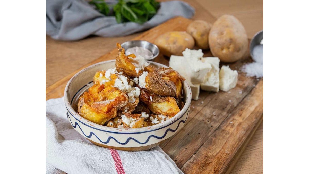 Cartofi zdrobiți și prăjiți, serviți cu telemea & maioneză cu usturoi (220g)/ A bit like skins, a bit like tots. Roasted, crushed then fried topped with telemea & served with garlic mayo (220g)