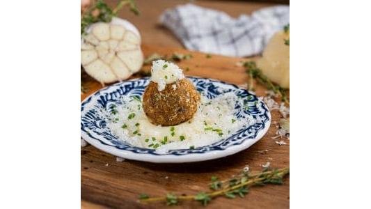 Cartofi zdrobiți și prăjiți serviți cu maioneaza de ceapă arsă(110 gr)/ Mashed and fried potatoes served with burnt onion mayonnaise (110 gr)