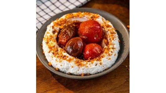 Crema de iaurt cu dukka si rosii cherry coapte cu harissa, Servit cu paine facuta in casa