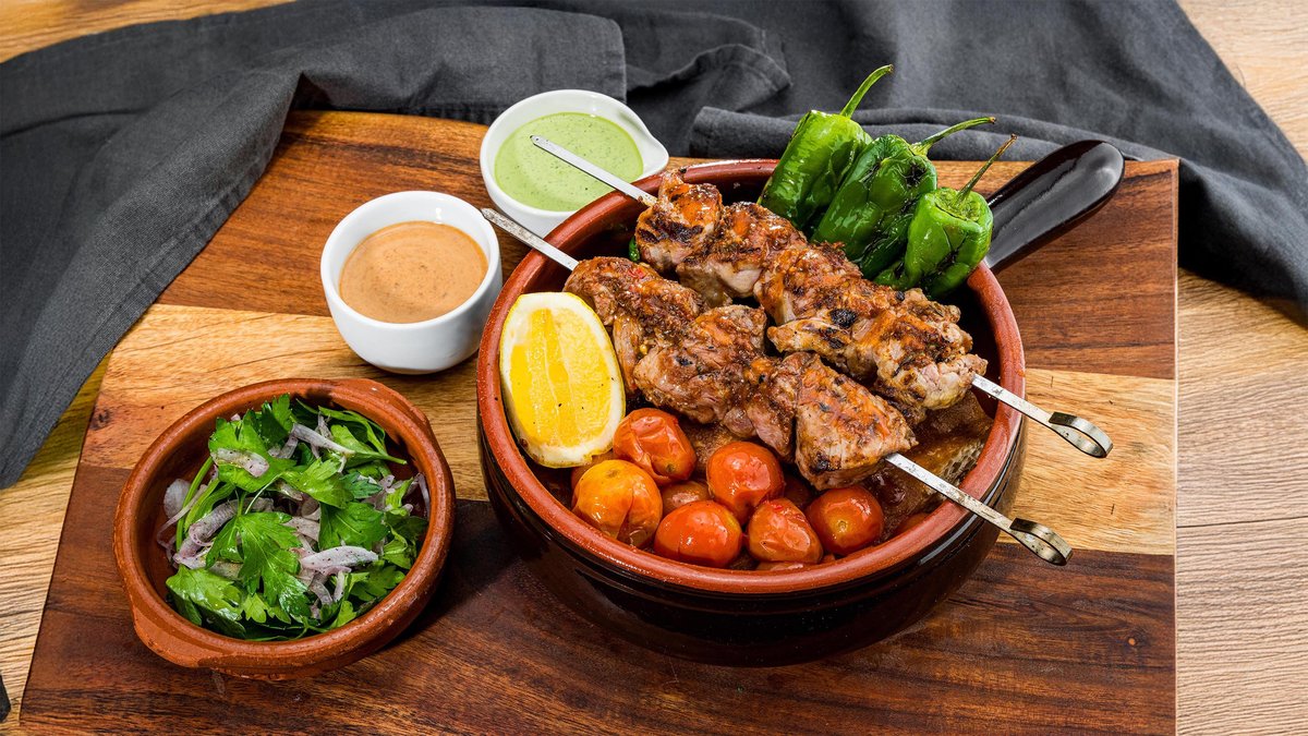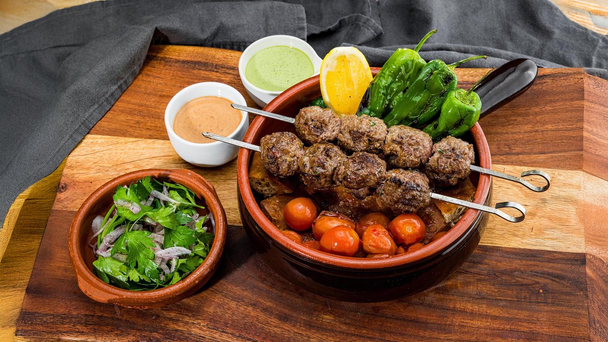 Warm garlic focaccia topped with padron peppers and harissa tomatoes, served in a terracotta pot. Comes with parsley and sumac onion salad, mint yogurt, and chilli date mayo. Spiced lamb mince blended with our own seasoning mix, shaped into koftas and grilled.