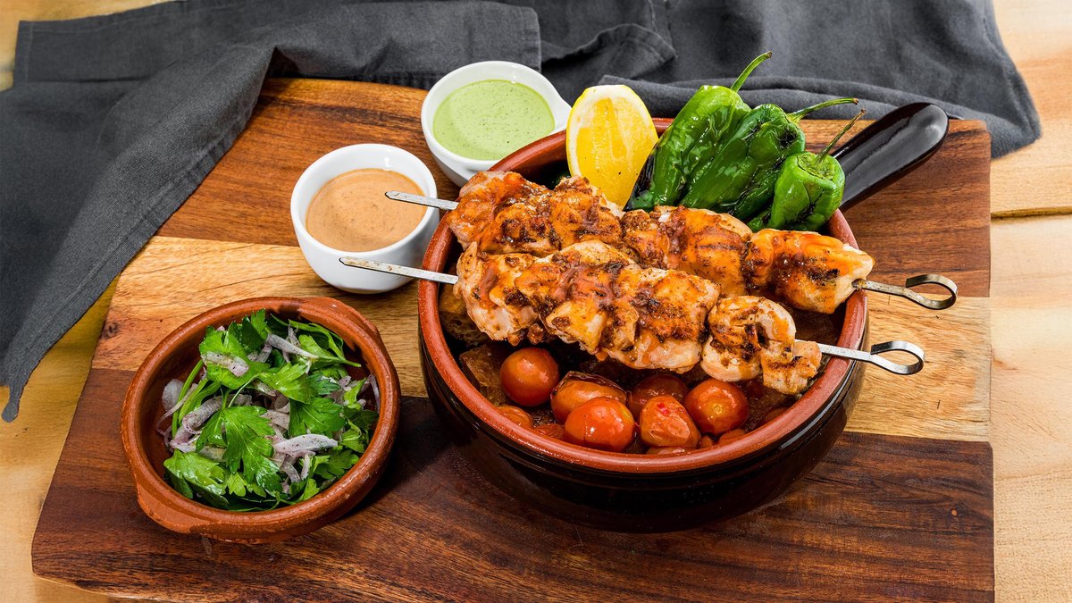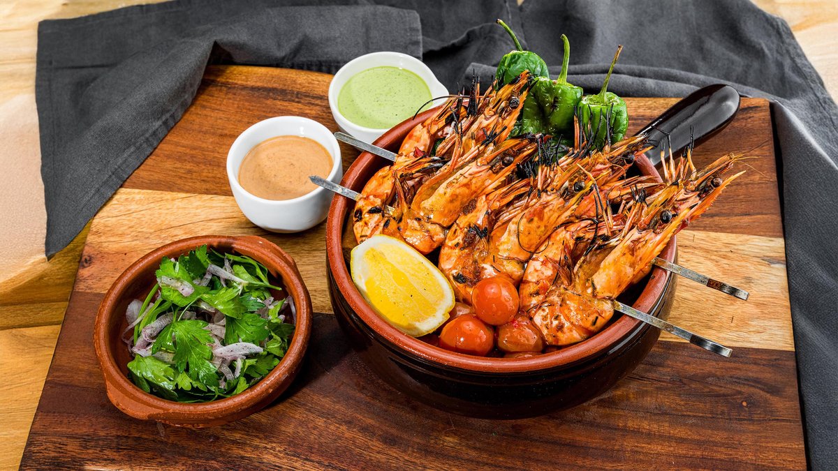 Warm garlic focaccia topped with padron peppers and harissa tomatoes, served in a terracotta pot. Comes with parsley and sumac onion salad, mint yogurt, and chilli date mayo. Sweet, juicy prawns (three per skewer) grilled and finished with aromatic butter.