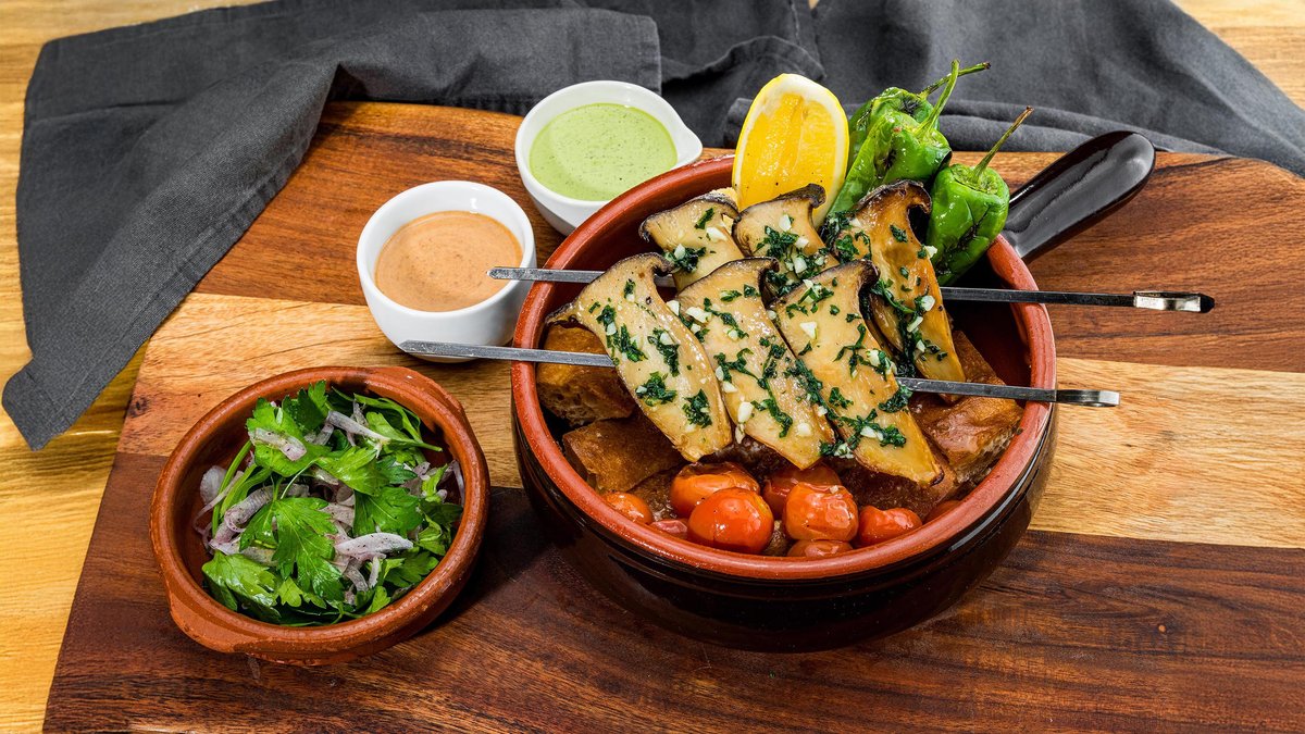 Warm garlic focaccia topped with roasted peppers and harissa tomatoes, served in a terracotta pot. Comes with parsley and sumac onion salad, mint yogurt, and chilli date mayo. Thick-cut king oyster mushrooms roasted with garlic and parsley.