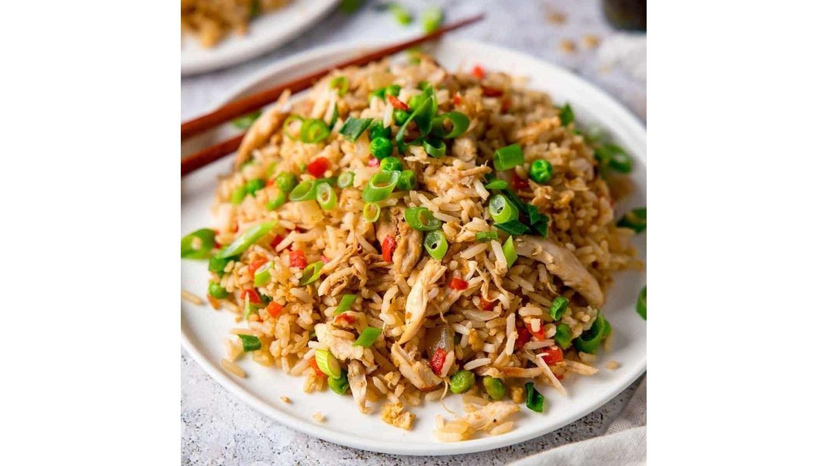Orez, pui, morcov, praz, ouă, usturoi, ghimbir. 400 g