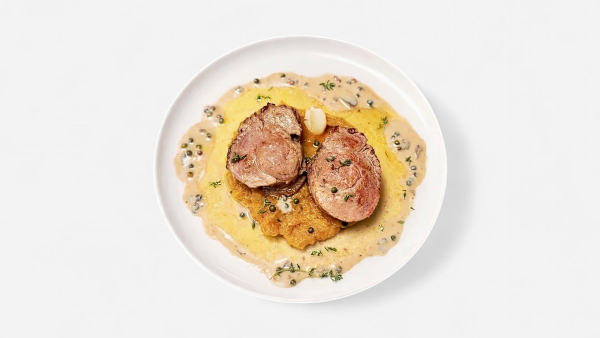 Mușchiulet de porc gătit în unt cu usturoi și cimbru, stins cu vin alb, alături de piure de dovleac și veloute de ciuperci și piper verde