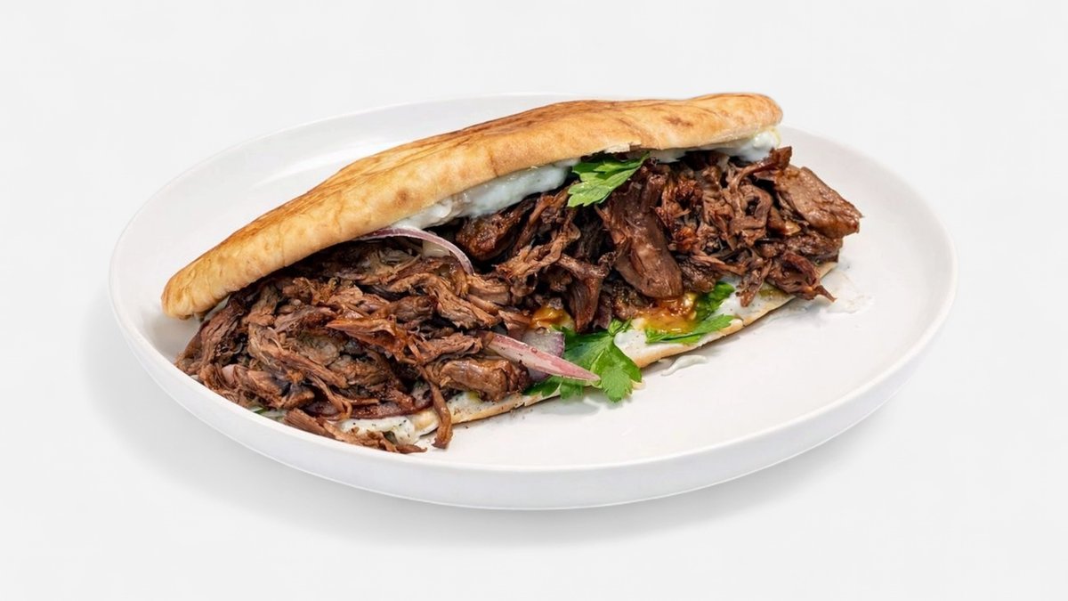 Pâine brioche, mușchi vită condimentată în stil turcesc, castraveți în saramură, ceapă, alioli cu lapte - 500g