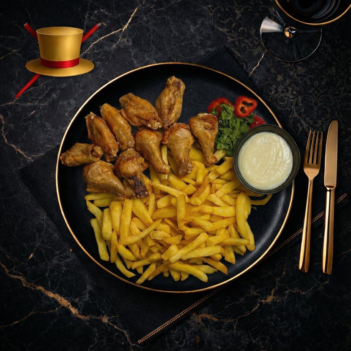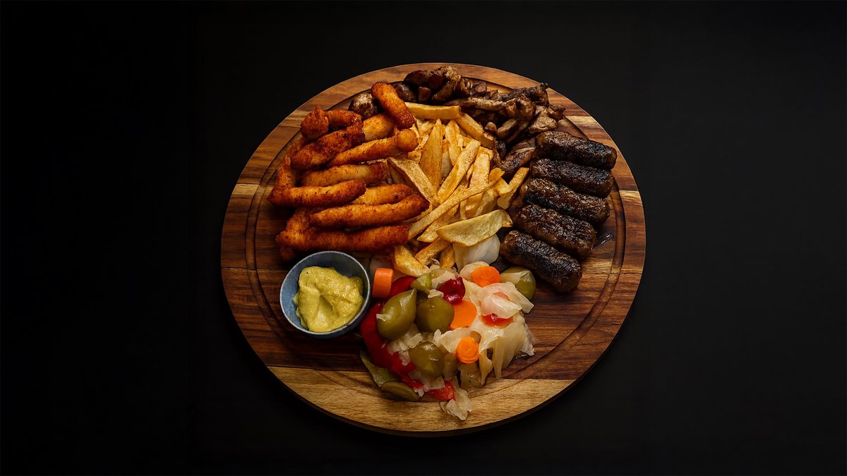 Jumări de pui, ceafă de porc, pastramă de oaie, cârnaţi cabanos, gujoane de pui cartofi prăjiţi, murături - 1.8kg