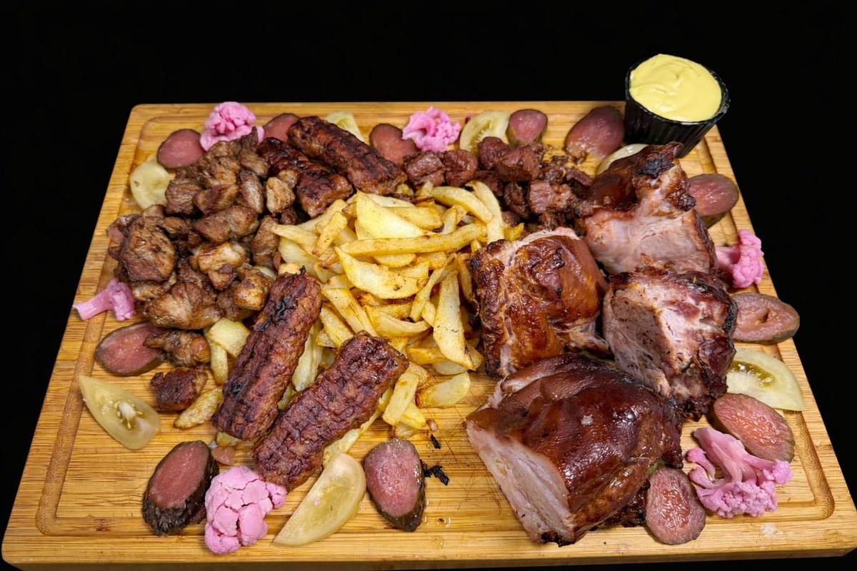 Pastramă de oaie, cotlete de berbecuţ, 4 mici, cârnaţi cabanos, cartofi prăjiţi, coaste de porc - 2.2kg