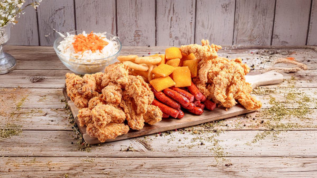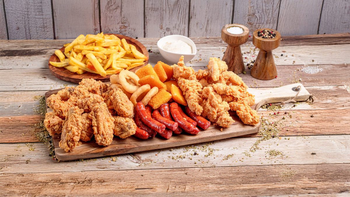 10 aripi , 10 strips, 10 carnați semiafumați, 10 crispy cheese gouda, 10 inele de ceapă, 4 porții de cartofi , 4 SOSURI