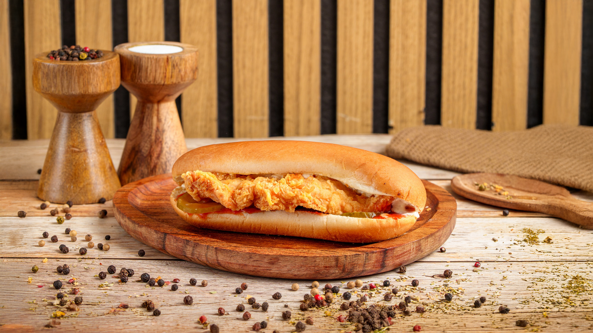 Chiflă 50g, strips pui 35g, castraveți murați 20g, ketchup, sos usturoi - 130g