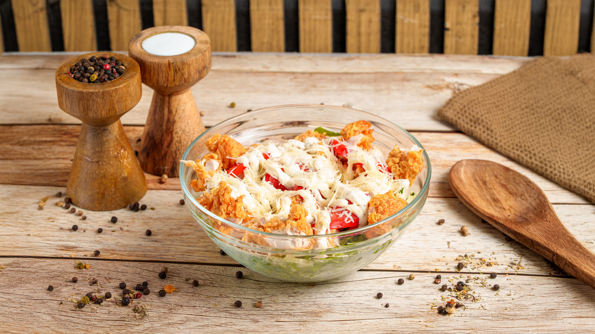 Crispy strips 3 bucăți, salată, roșii, sos Caesar, parmezan - 320g