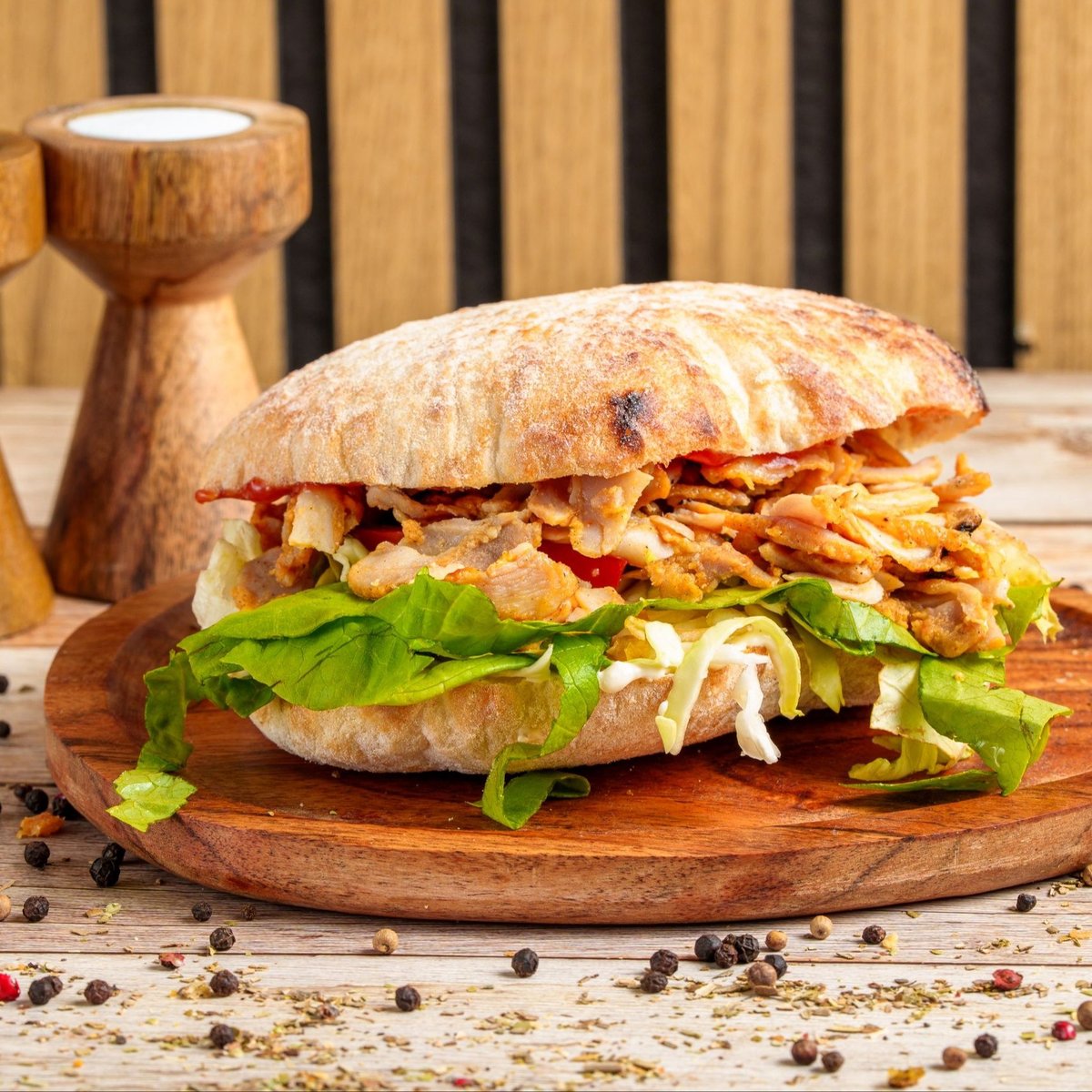 Chiflă, carne donner pui, mix salată, roșii, castraveți murați, sos usturoi, ketchup - 300g