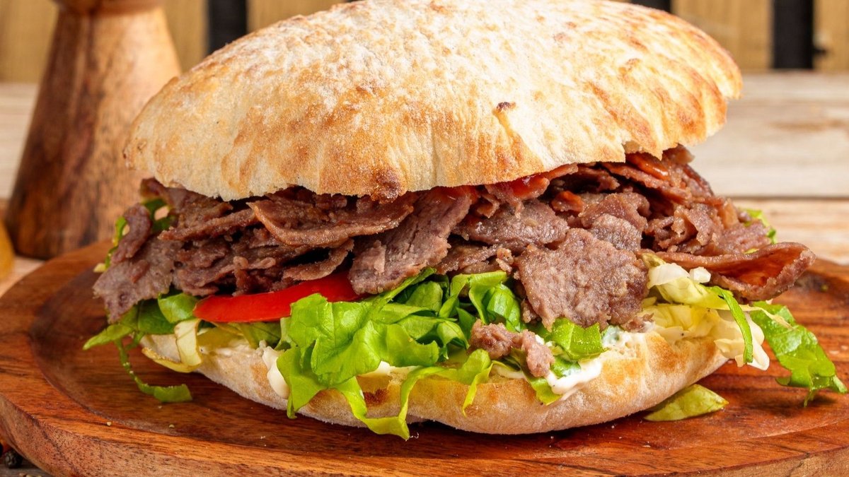 Chiflă, carne donner vițel, mix salată, roșii, castraveți murați, sos usturoi, ketchup - 300g