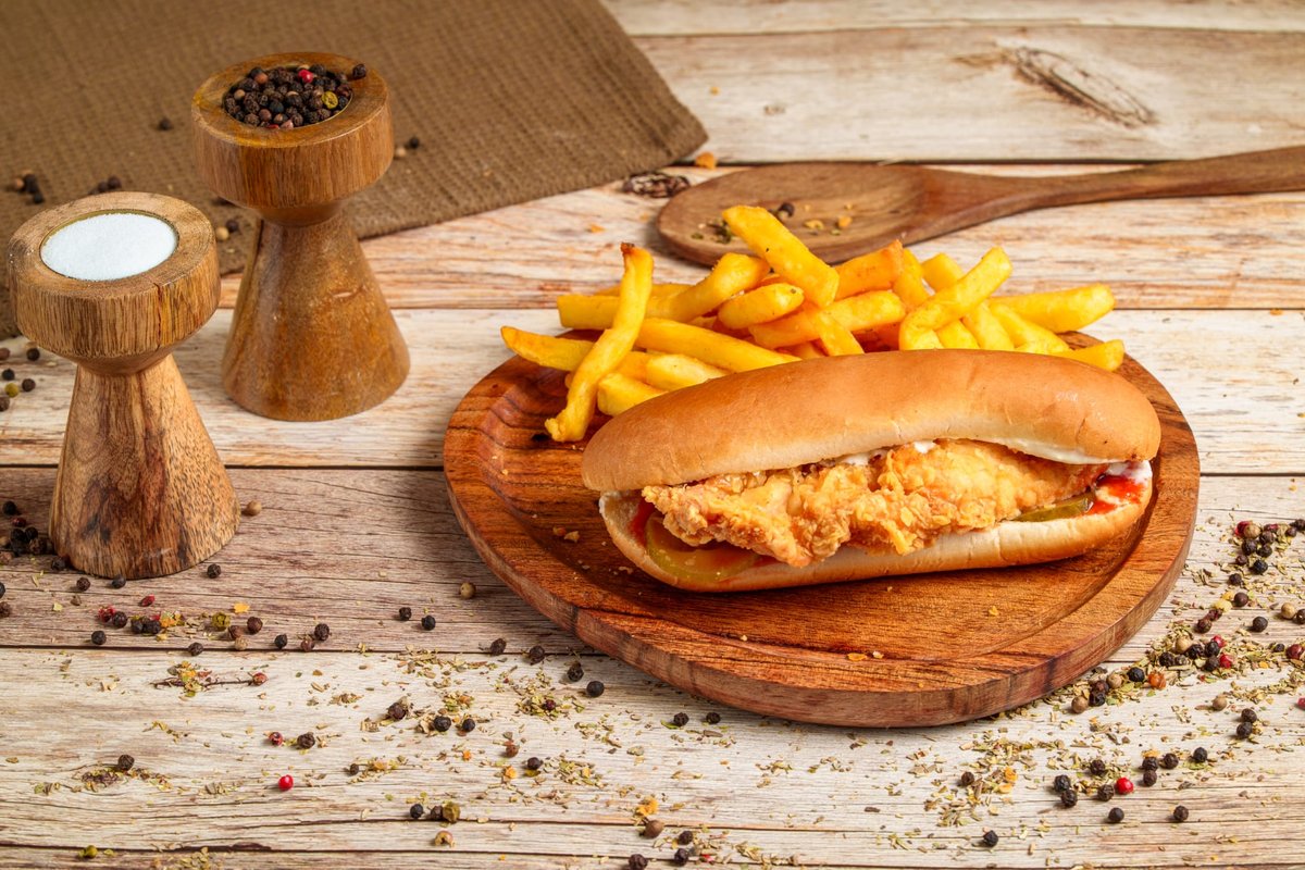 Chiflă 50g, strips pui 35g, castraveți murați 20g, ketchup, sos usturoi + 1 portie cartofi