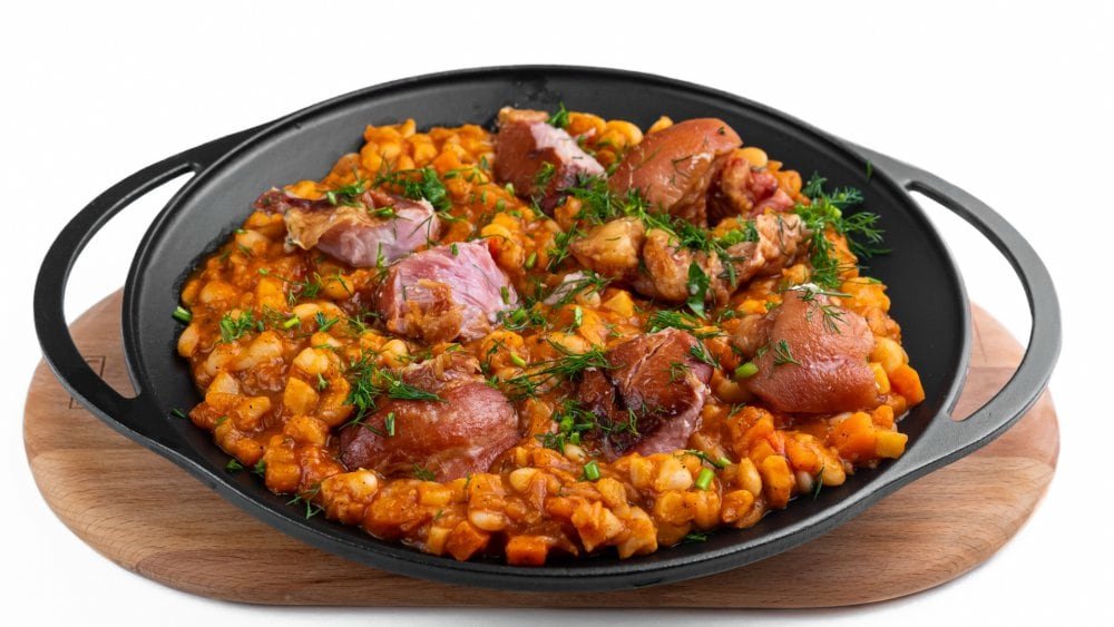 Afumătură, kaizer, ceapă, fasole, morcov, bulion, țelină, pastarnac, suc de roșii, condimente 6 porții – 2,4 kg