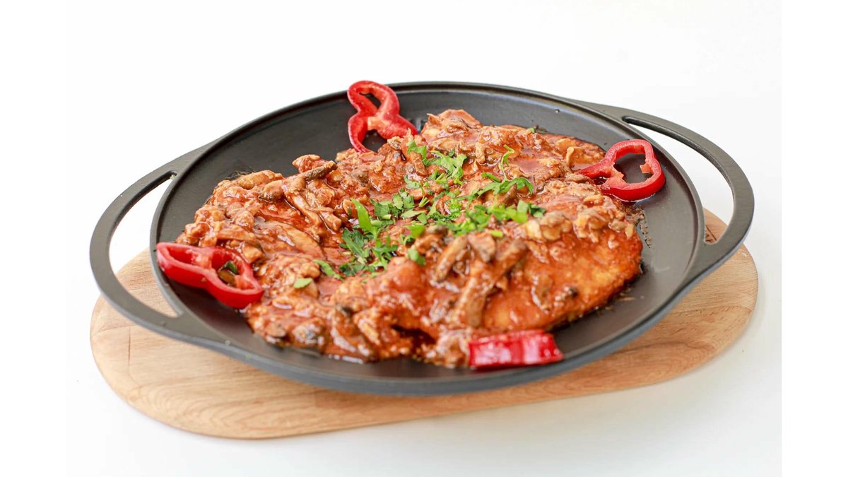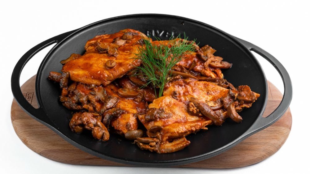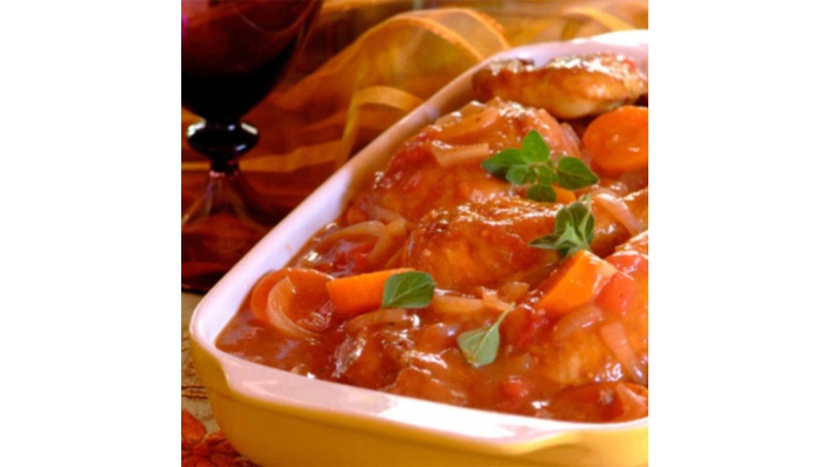 Piept de pui, suc de roșii, ciuperci, făină, condimente, sare, piper șI vin 4 porții – 800 g